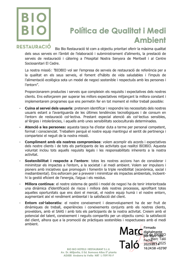 El director general de BIO BIO, Josep M. Azcàrate, valora l’atorgament d’aquest segell i afirma que “és un reconeixement a la nostra vocació per elaborar plats amb productes ecològics, alhora que aporta valor a la marca i ens fa sentir orgullosos de ser la primera cuina central 100% ecològica d’Andorra a l’obtenir en el seu moment la certificació europea per a producció de productes ecològics”.